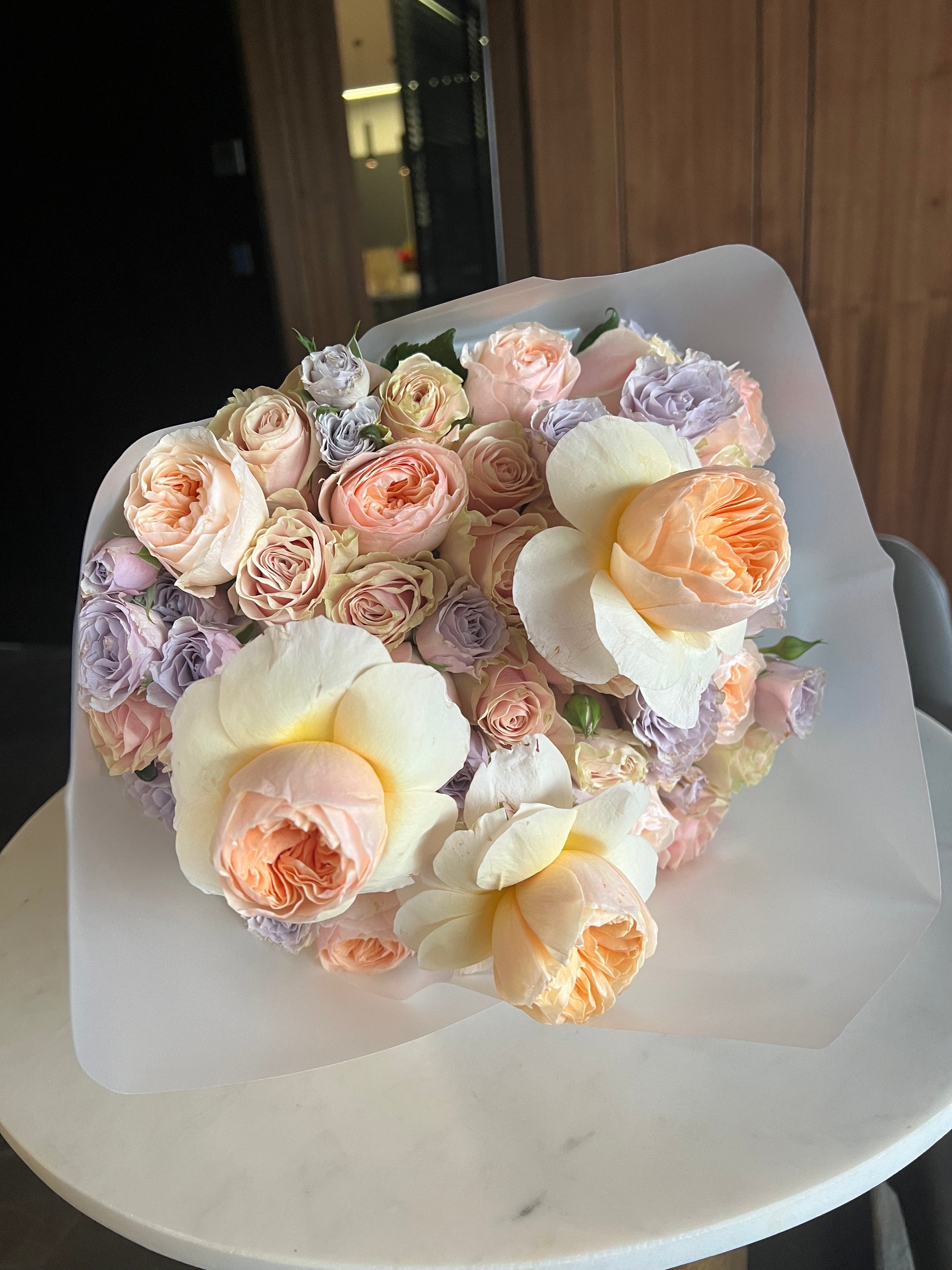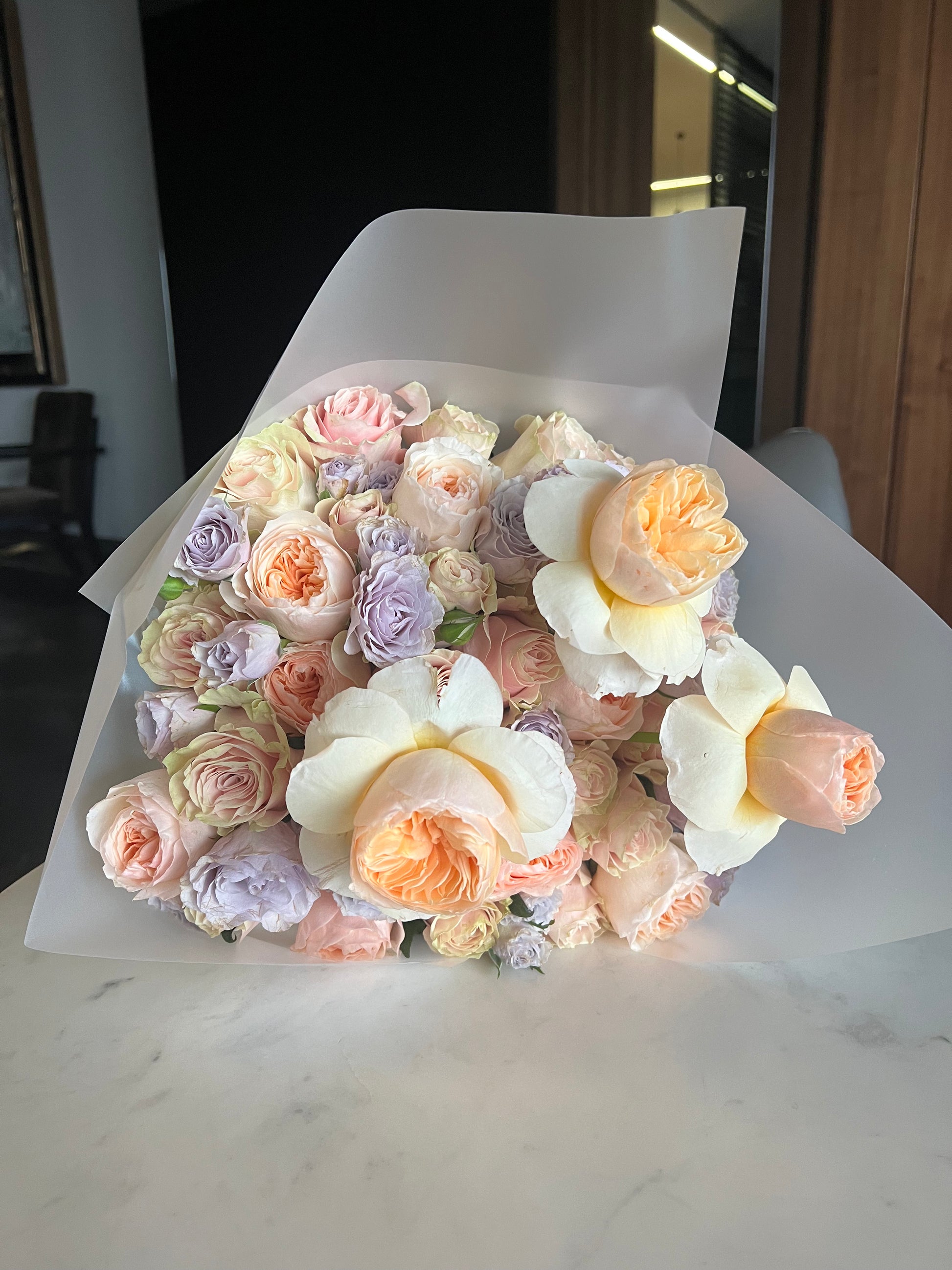 Ramo de 25 rosas rosa con mini rosa lila y rosas inglesas en papel blanco