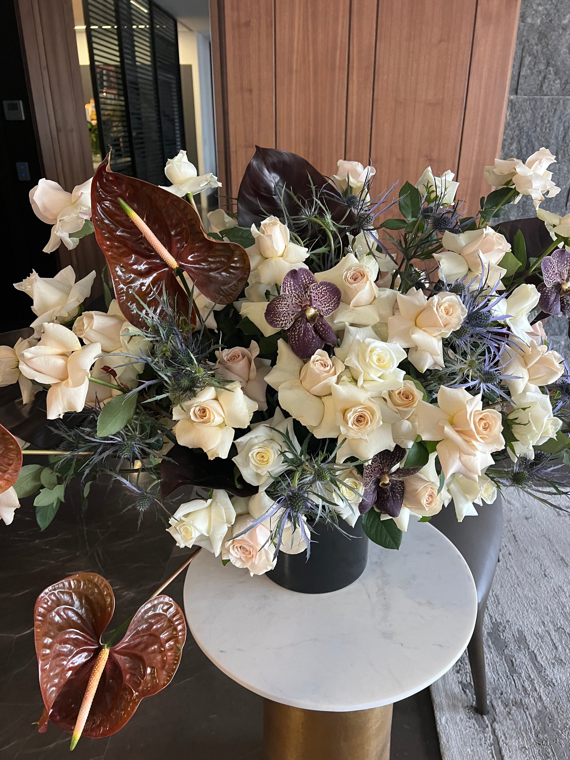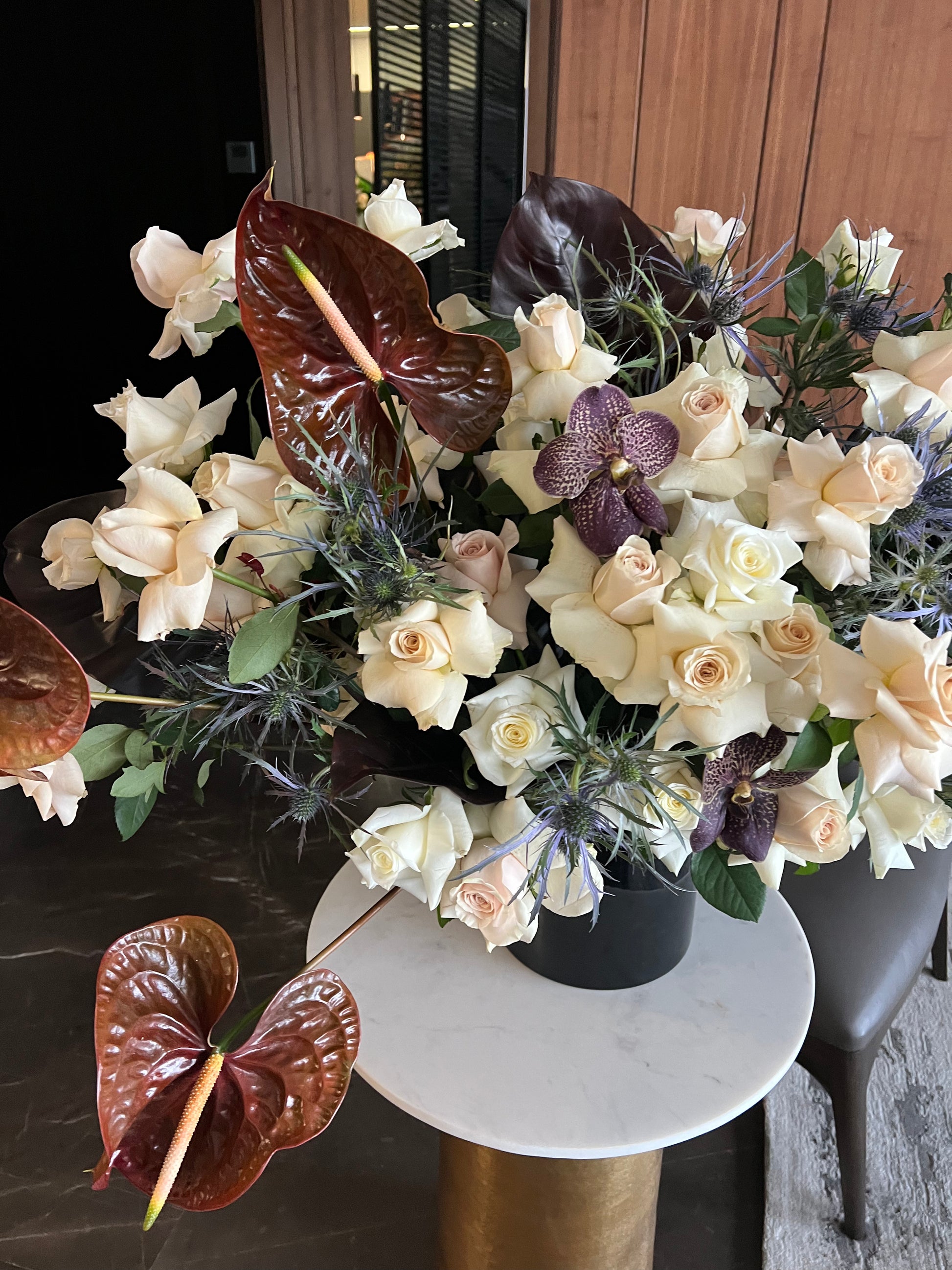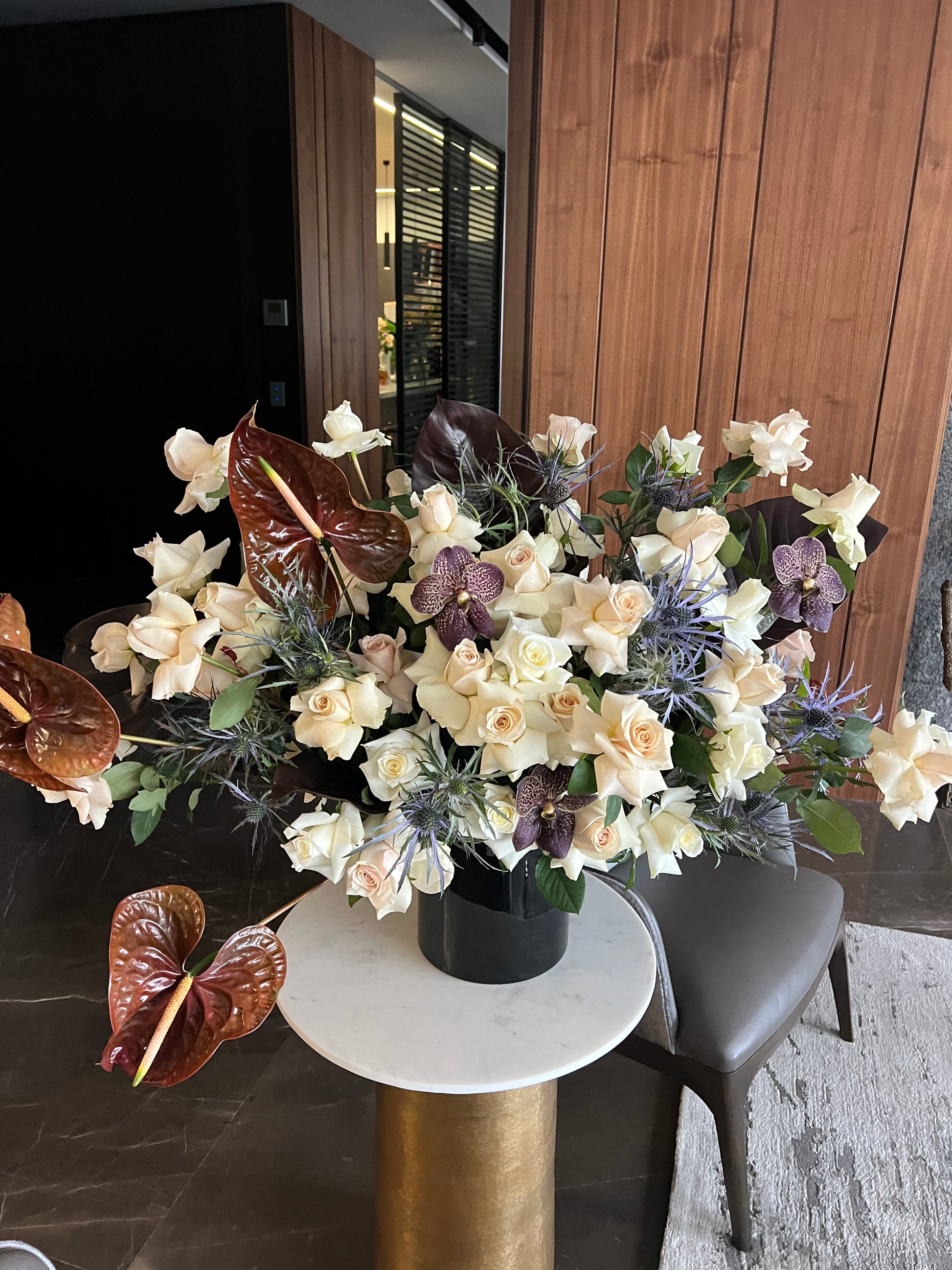 Arreglo de 50 rosas con eryngium, hojas cardenal black, orquídea vanda y anturios en base negra