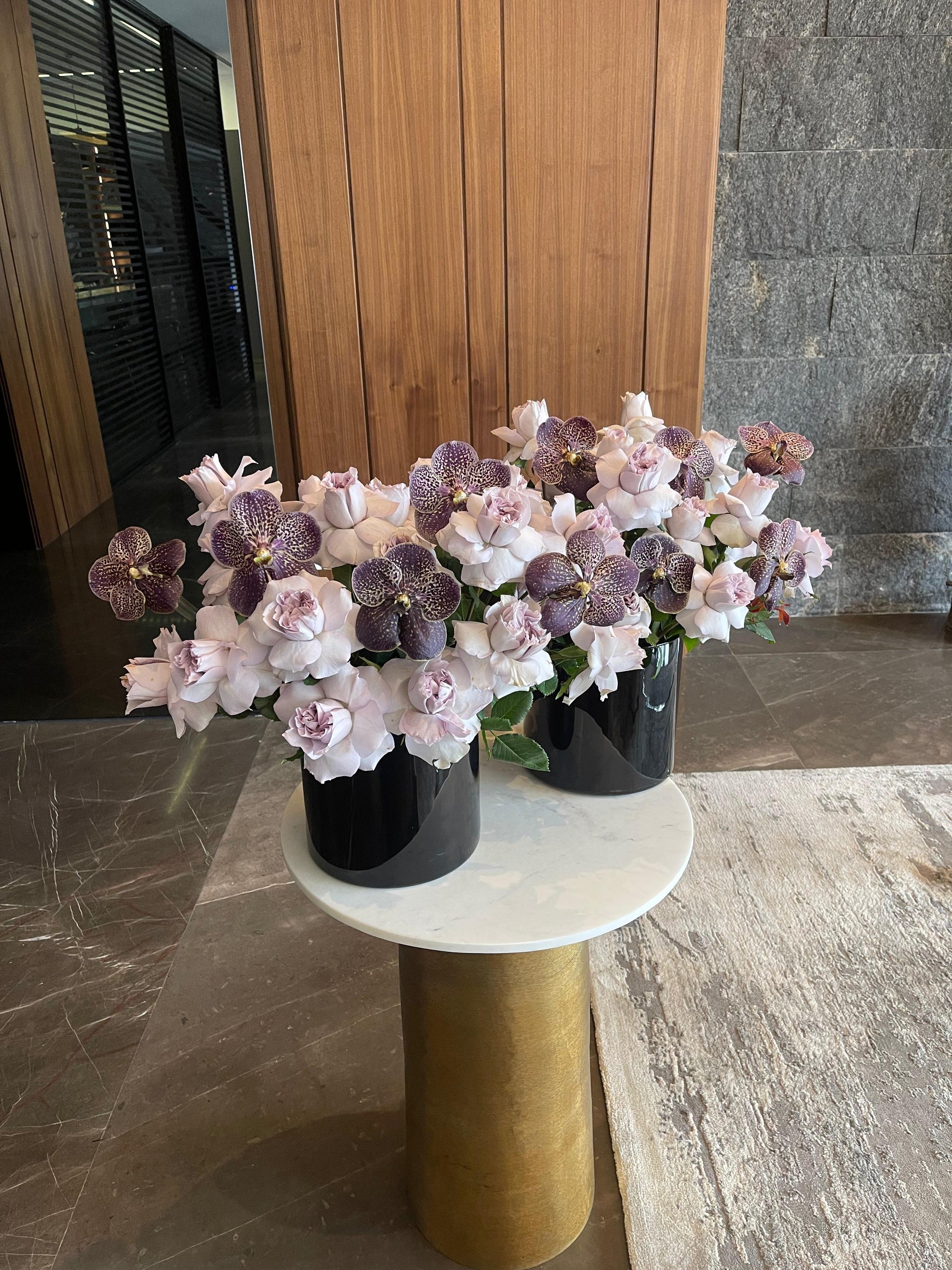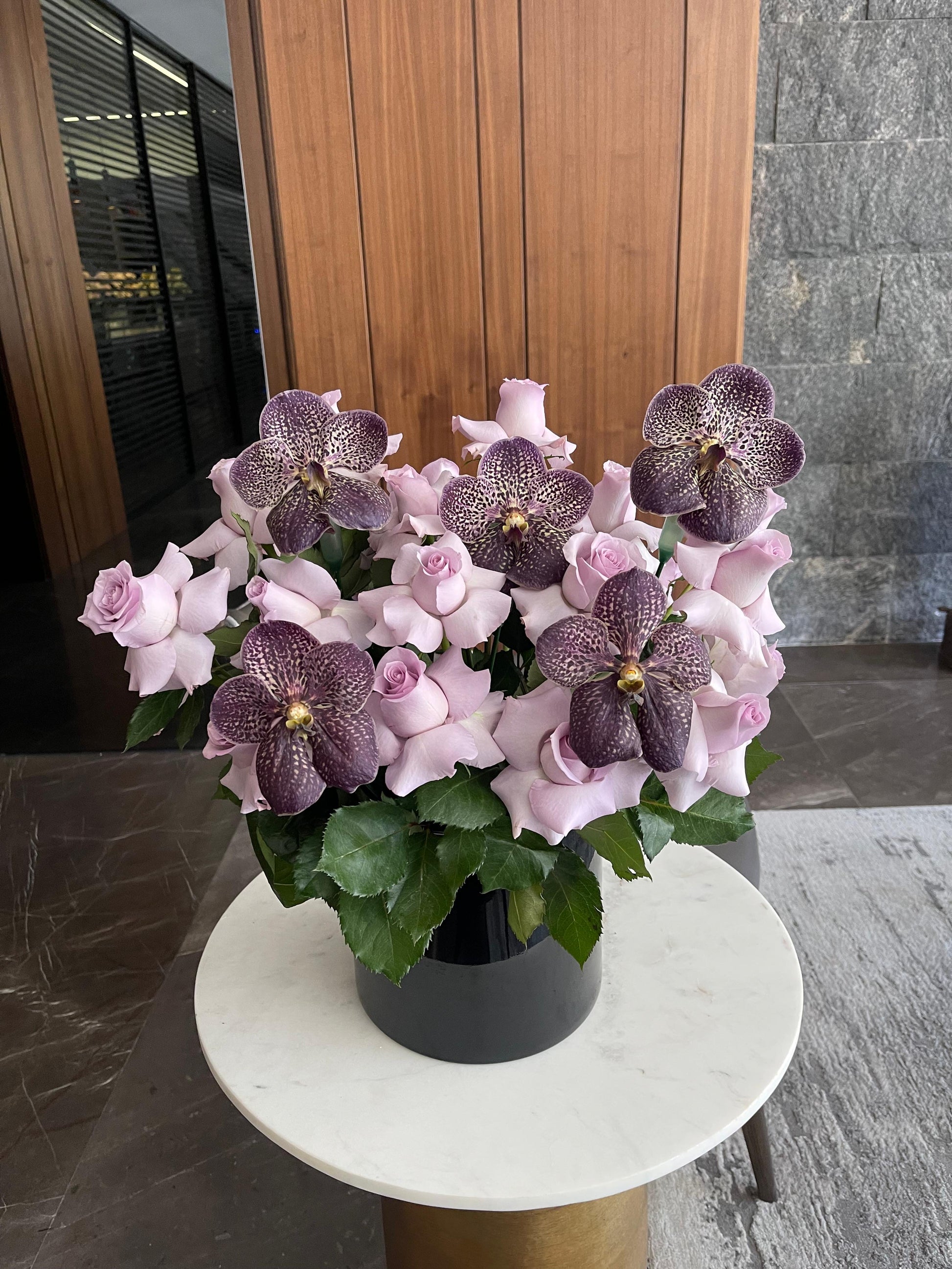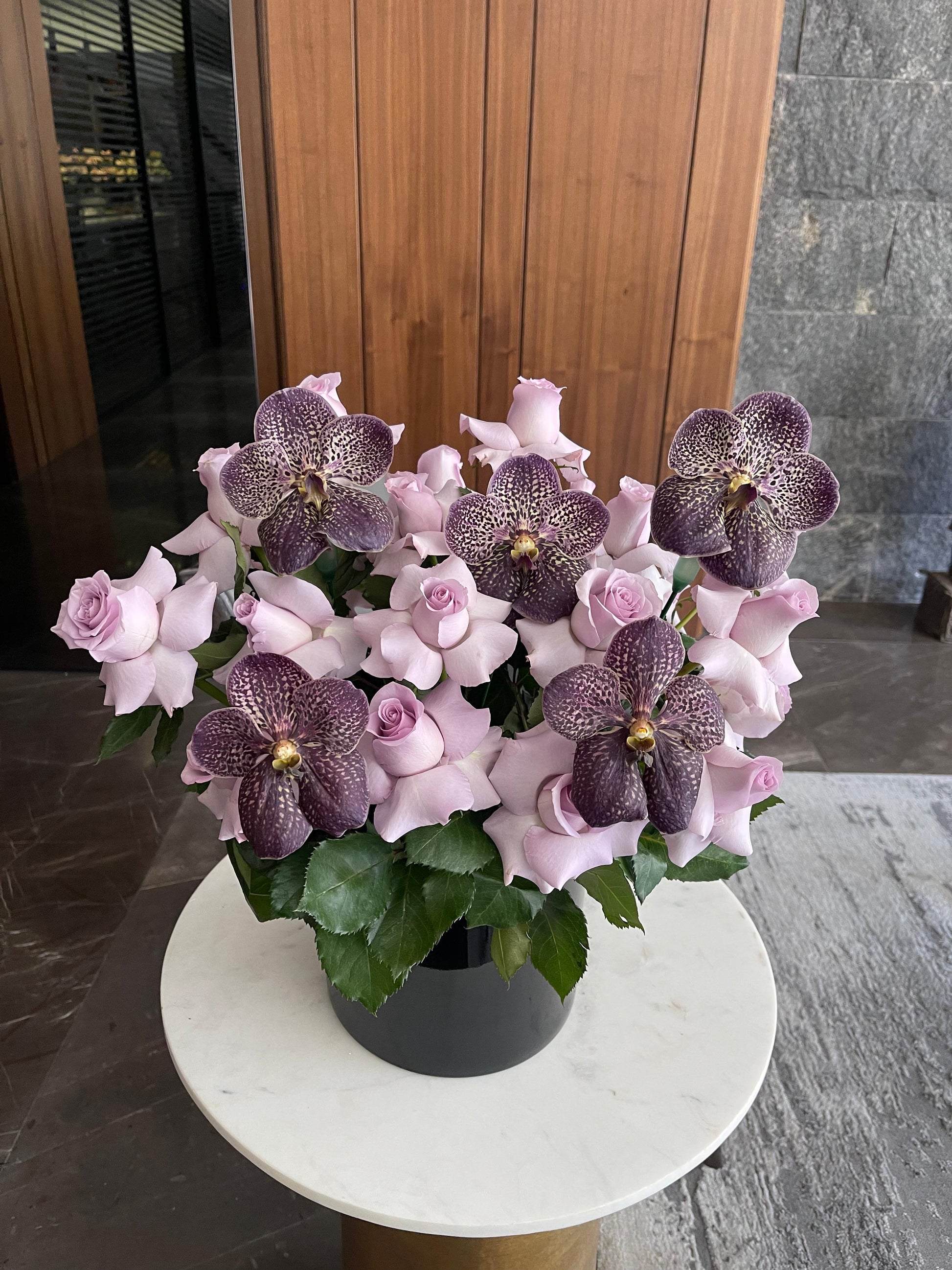 Arreglo de 25 rosas moradas con 5 vandas