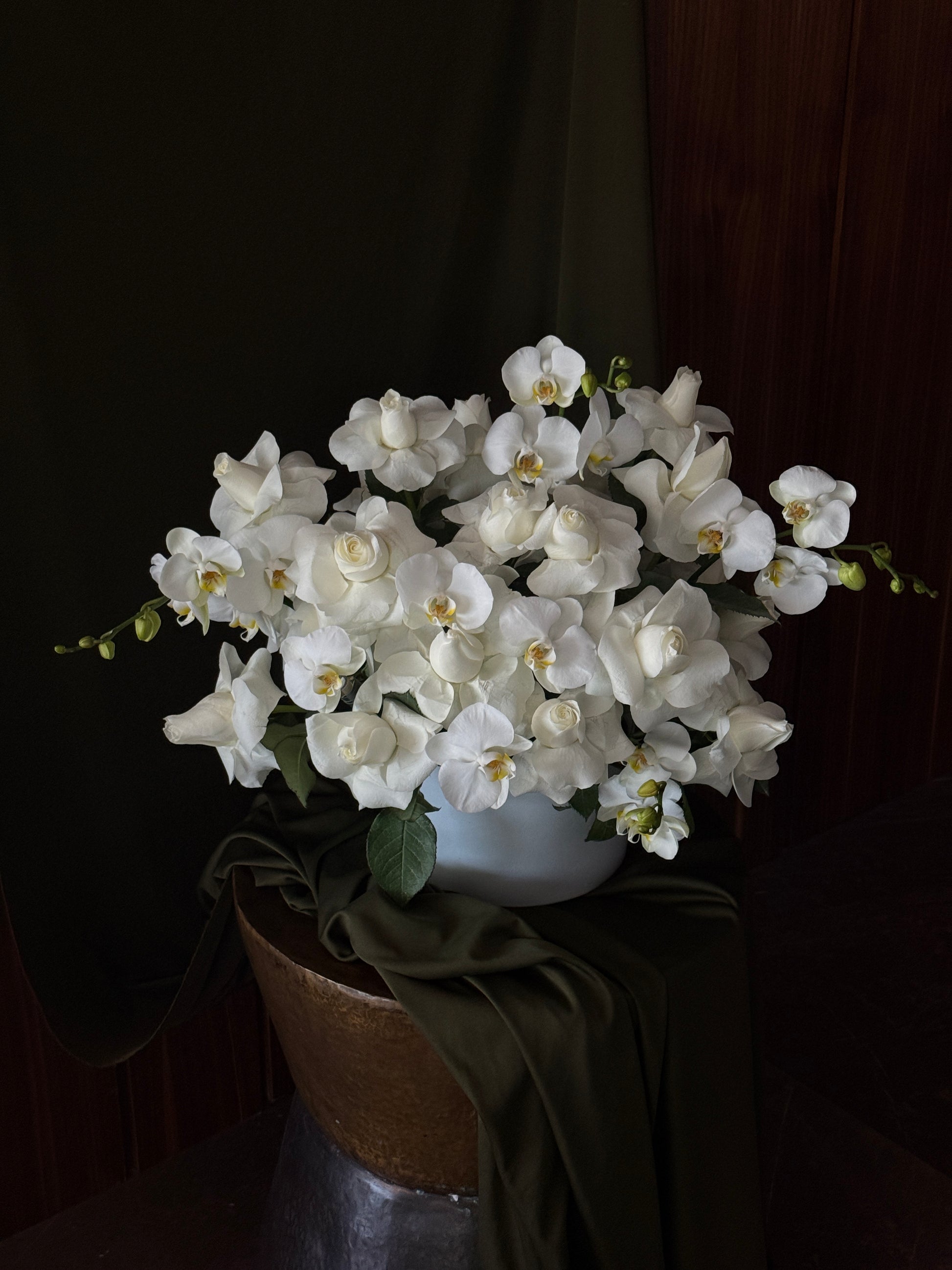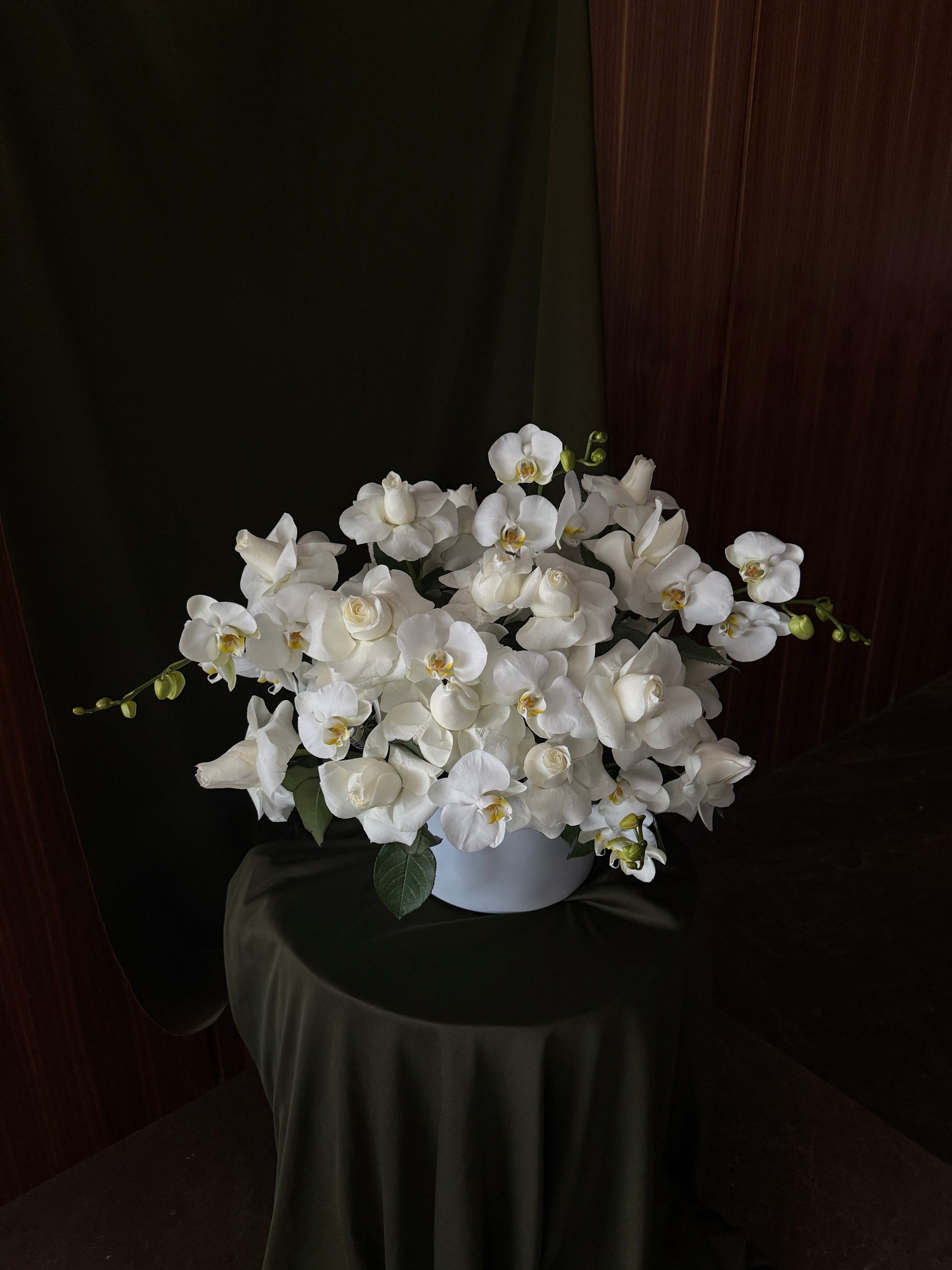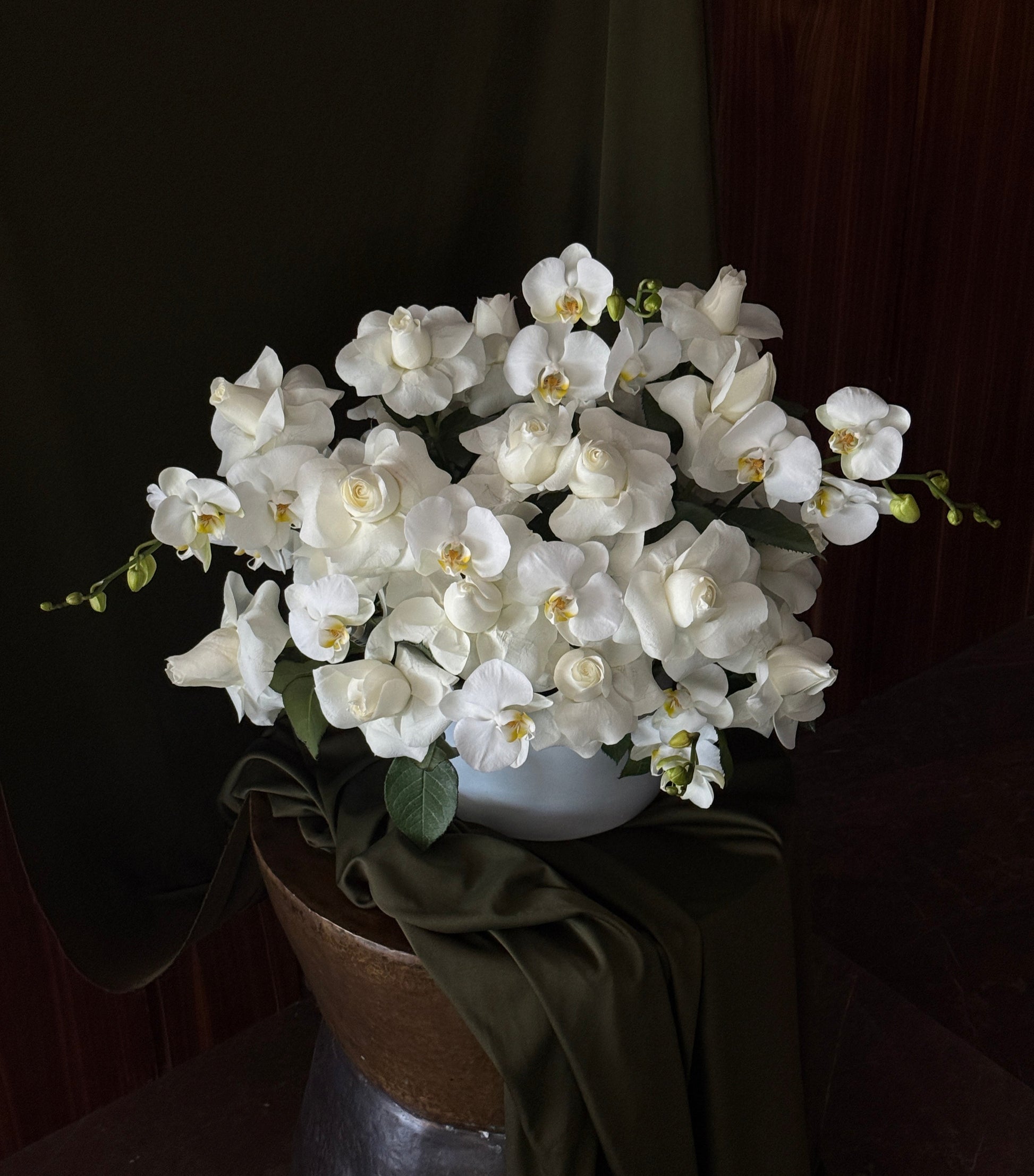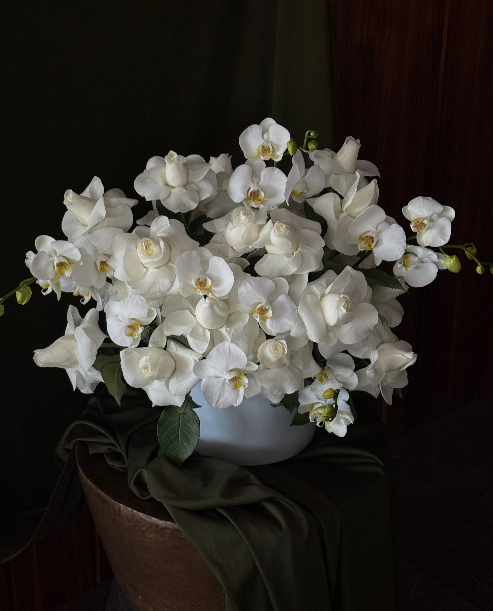 Arreglo de 25 rosas blancas con 6 tallos de orquídea phalaenopsis en base blanca